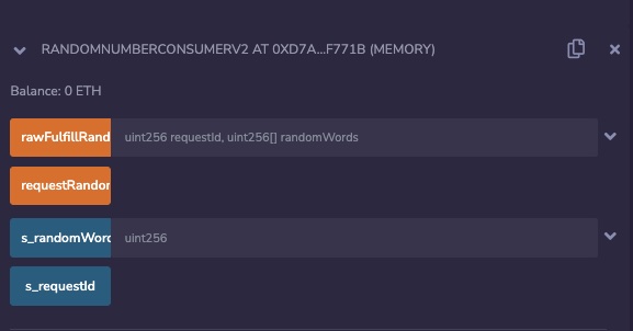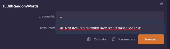 2. Click fulfillRandomWords and fill in _requestId with your VRF request ID and _consumer with your consumer contract address.