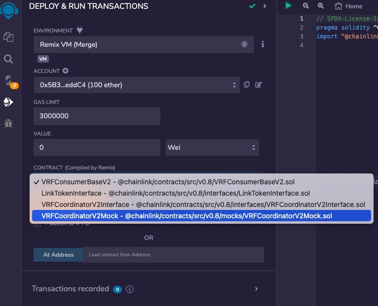 2. Under DEPLOY & RUN TRANSACTIONS, select VRFCoordinatorV2Mock.