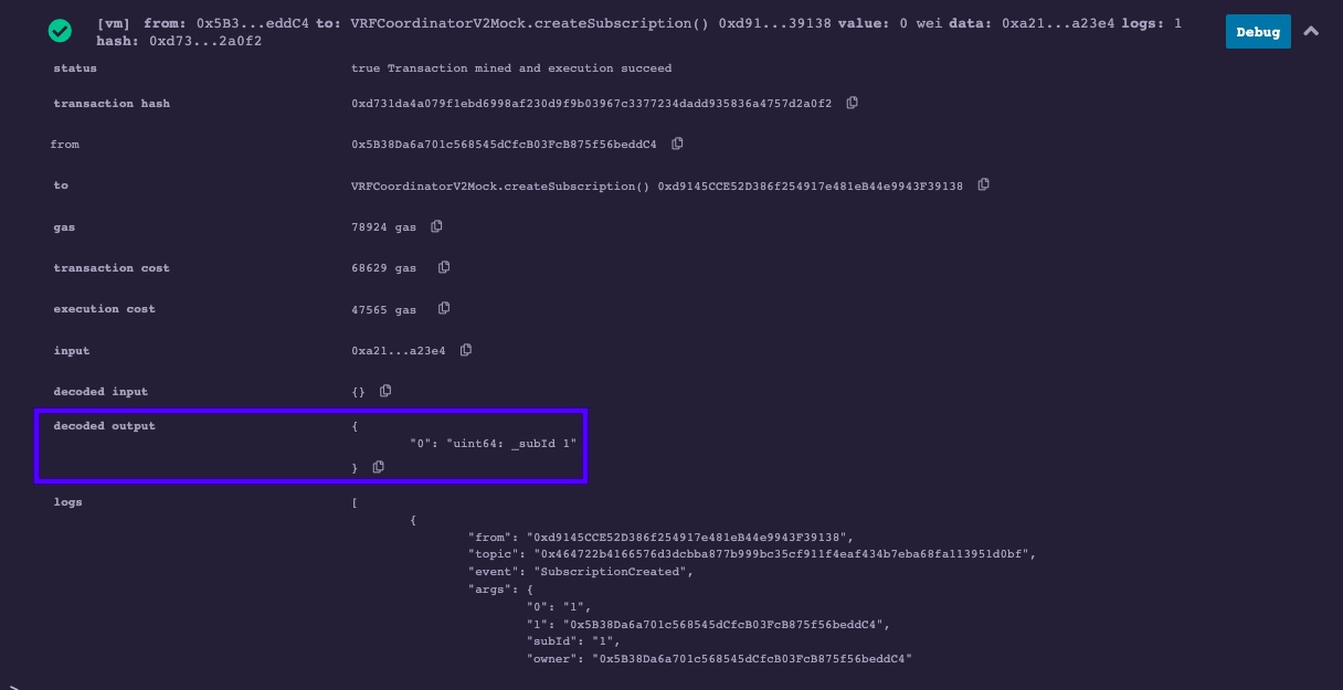 2. In the RemixIDE console, read your transaction decoded output to find the subscription ID. In this example, the subscription ID is 1.